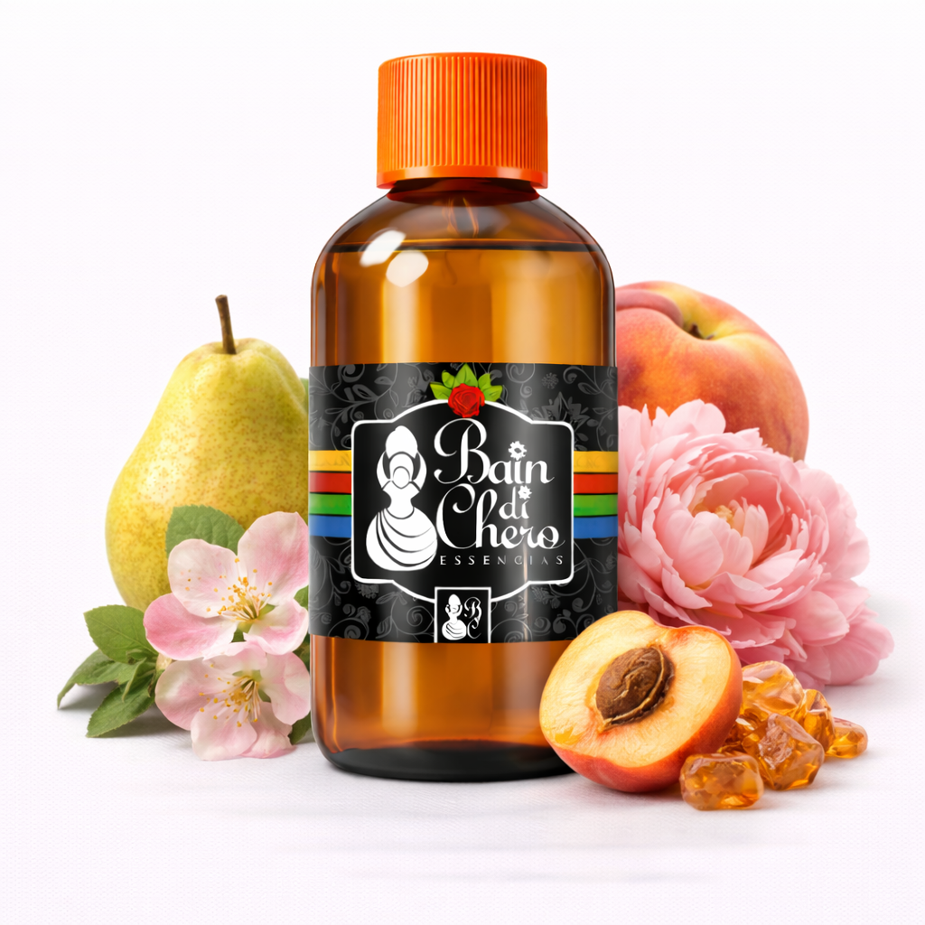 No coração, a peônia se mistura ao pêssego e ao damasco, trazendo um corpo frutado floral macio, delicado e extremamente agradável. Ao fundo, o âmbar se une à fava tonka e à madeira de ébano, formando um rastro quente, elegante e levemente amadeirado, com excelente fixação.